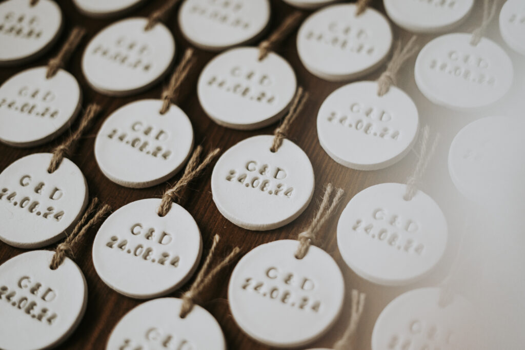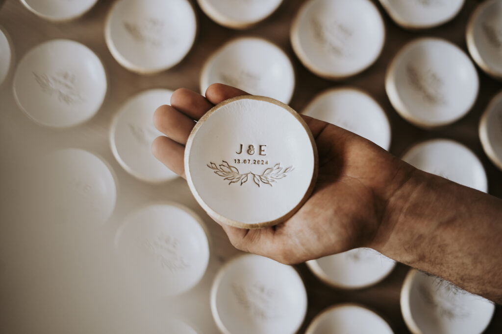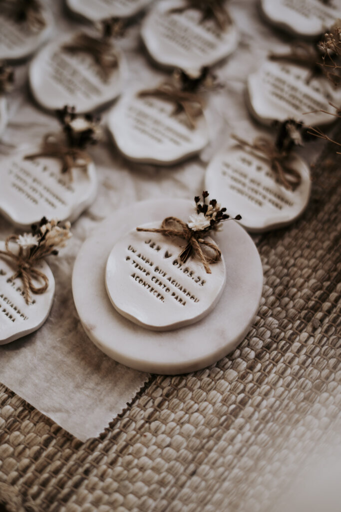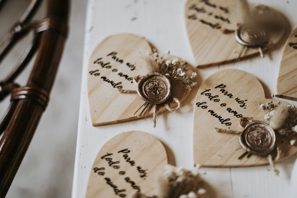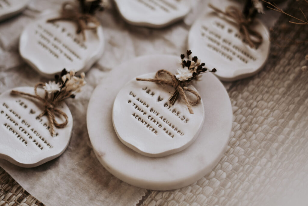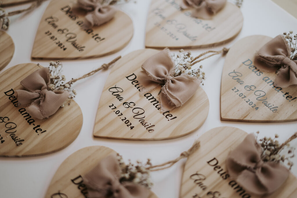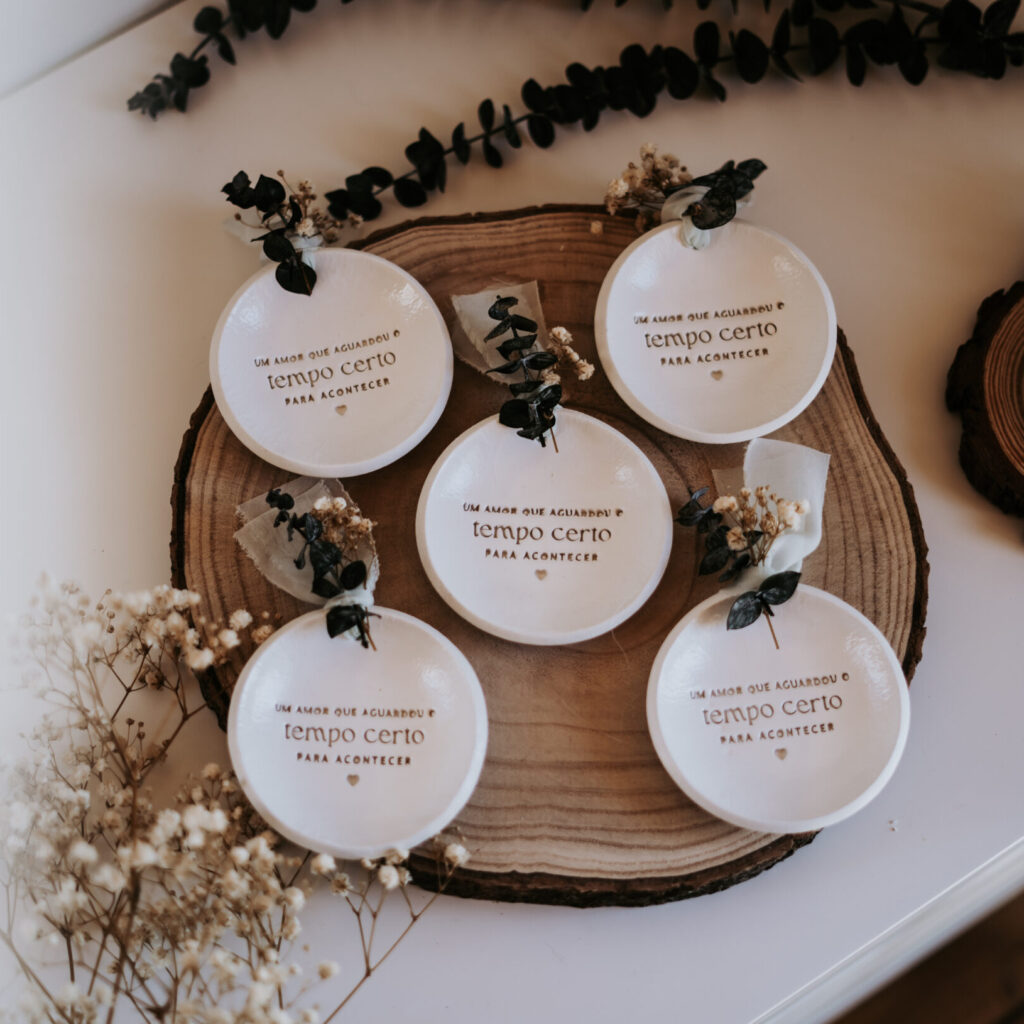 As nossas lembranças são pensadas para prolongar o vosso dia — pequenos gestos que os vossos convidados levam consigo, cheios de significado. Todas as peças são 100% personalizadas, criadas à vossa medida e com a vossa essência.