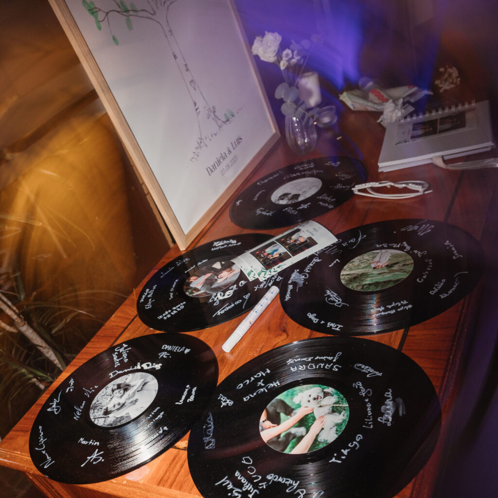 Aqui encontram livros de honra 100% personalizados, com vários materiais e uma ampla paleta de cores, memoriais, jarras de mensagens, discos de vinil para assinaturas, placas de madeira, caixinhas para mensagens e até o aluguer da nossa câmara Instax.